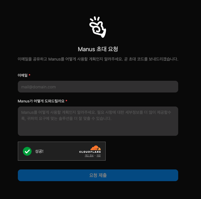 • 구체적인 사용 목적 작성: 단순 “초대장 주세요”보다는, 본인의 전공, 프로젝트 계획, 그리고 향후 목표를 명확하게 기술해 Manus AI 팀에게 ‘진짜 필요’하다는 인상을 주어야 합니다.